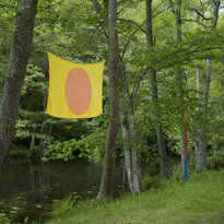 Farbige Holz- und Textilobjekte im Naturraum, Spiel mit Licht und Spiegelungen im bewegten Wasser und räumlicher Perspektive zwischen den Objekten.